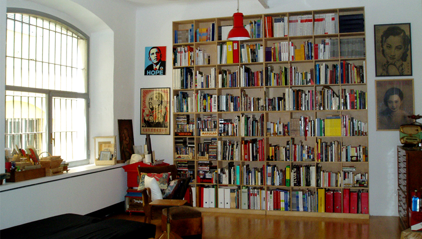 The square module is multi-functional: made with birch plywood panels, open is a bookcase, closed with doors it becomes a closet till to make up entire inner walls.